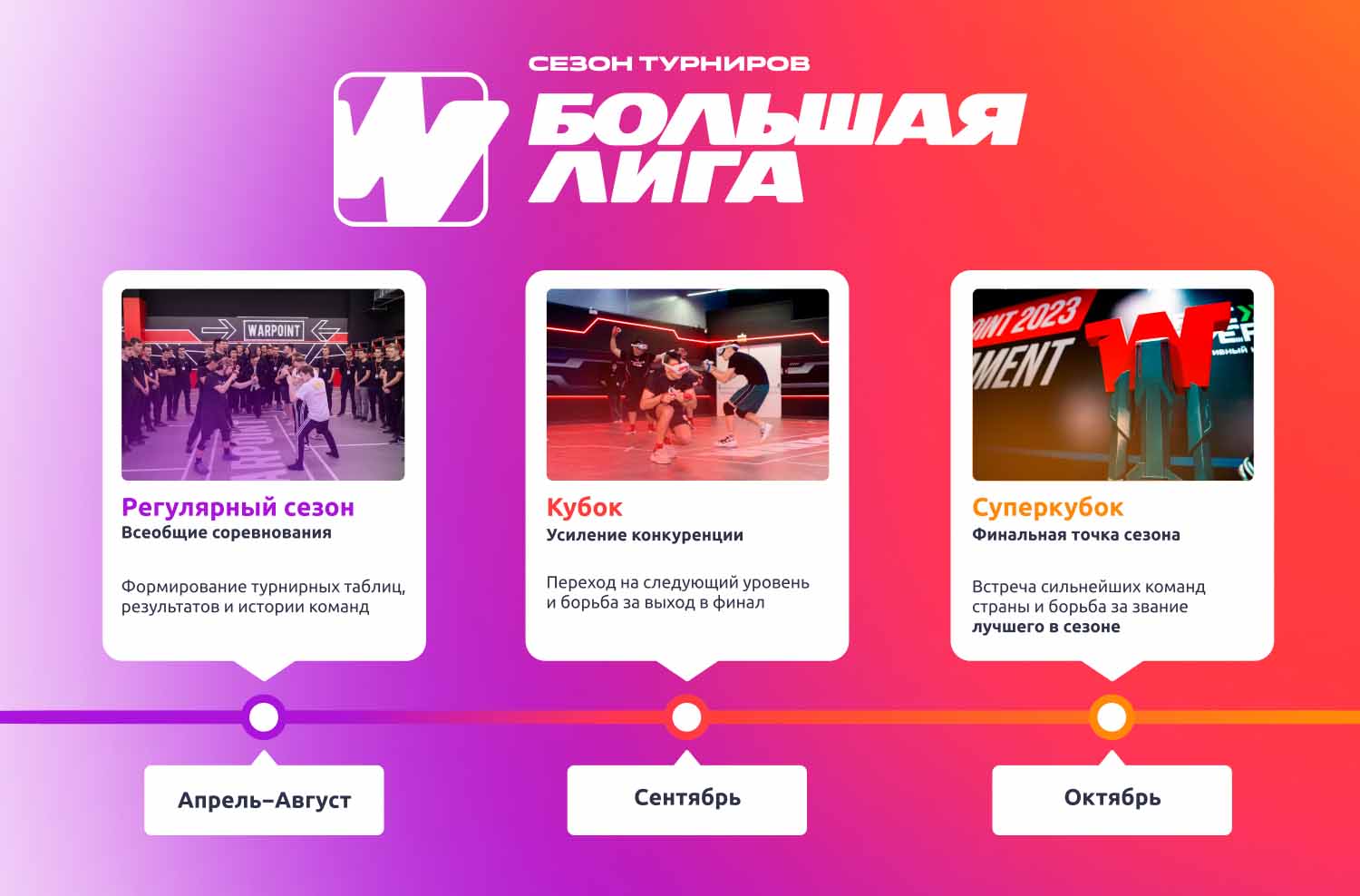 Большая лига собирает в одну систему всё, к чему сцена WARPOINT шла последние годы: регулярные матчи, рост команд, серьёзную конкуренцию и понятный путь от первых игр до главной стадии сезона. Для одних составов это будет шанс выйти на новый уровень, для других — возможность впервые пройти большой турнирный маршрут без длительных перерывов.